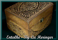 Essa peça, ao lado, foi meu primeiríssimo trabalho de entalhe. Foi com ela que eu entrei em contato com o aparelho e as peças pela primeira vez e tive que aprender na base da tentativa e erro para o que cada uma servia, além de me acostumar com a potência do aparelho, o que dava e o que não dava para fazer com ele, o que seria exigido de mim durante a execução do trabalho, etc. Foi com essa caixinha que aprendi que o entalhe, basicamente, é se retirar a parte negativa do desenho, ou seja, o fundo. O que sobra, é o entalhe.
