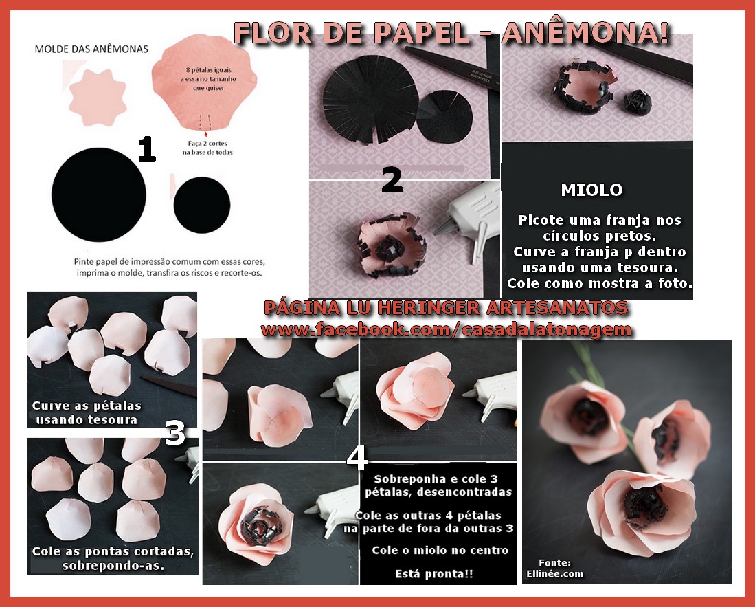Hoje, trago um pap fotográfico ensinando a fazer uma anêmona. Fica tão linda e delicada! Dá para aplicar em scrapbooking, como decoração em caixas de mdf e como enfeite em embrulhos de presentes especiais. Publiquei esse pap na minha página de artesanatos e todos estão convidados a participar. É só clicar no link abaixo e clicar em 'curtir' a página que já fará parte de nossa turma! Tem muita coisa lá que não trago para cá e você poderá ampliar seus conhecimentos artesanais, ok?